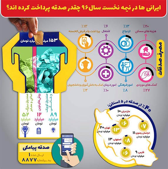 در شش ماه اول سال ۱۳۹۶، ایرانی ها بالغ بر ۱۵۳ میلیارد تومان صدقه پرداخت کرده اند، که از این مبلغ تهرانی ها با ۲۰ میلیارد و اصفهانیها با ۱۳ میلیارد تومان بیشترین سهم را به خود اختصاص داده اند.